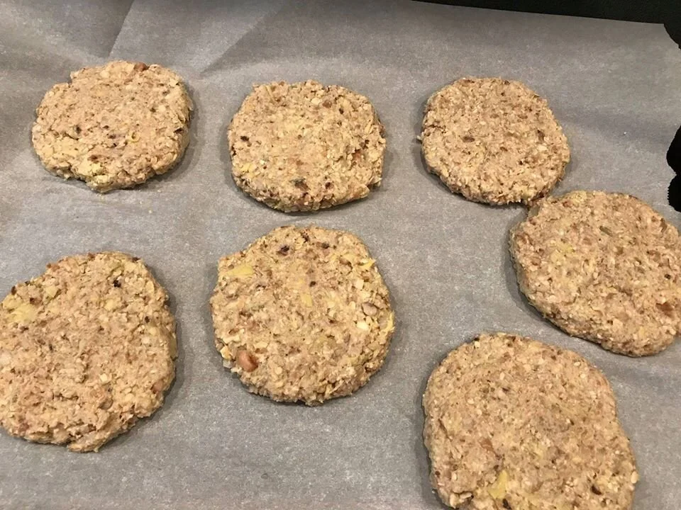 Divided the dough into 7 balls and place on a baking sheet lined with parchment paper. Use fingers to flatten into patties.