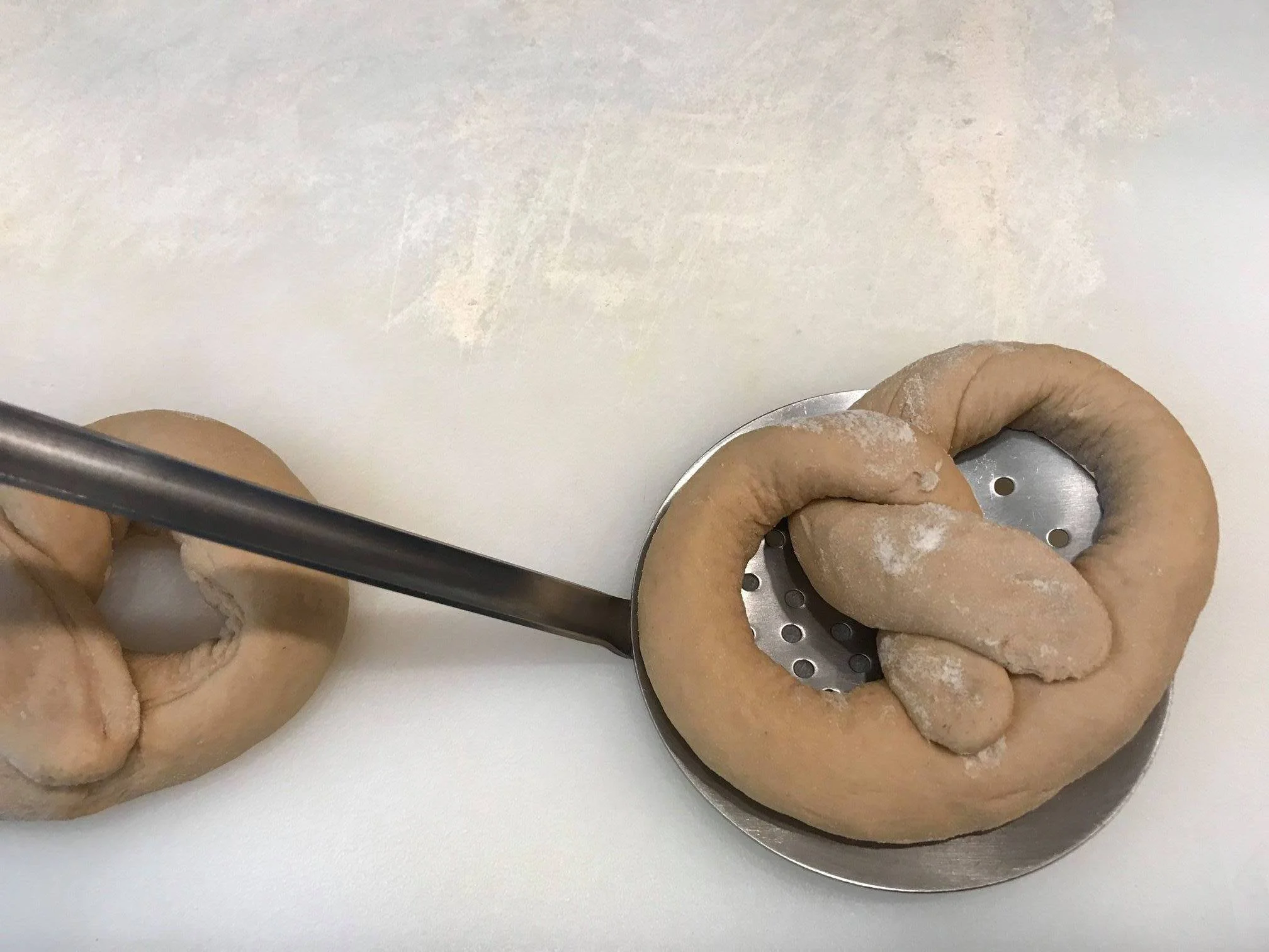 8. In a medium pot, add the 5 cups of water and 1/3 cup baking soda. When at a very light boil, submerge one pretzel at a time using a large spoon with holes for 30 seconds. (Next time I will press the edges down more firmly and submerge the pretzel dough in the water with the free ends down so they don't easily come loose.)