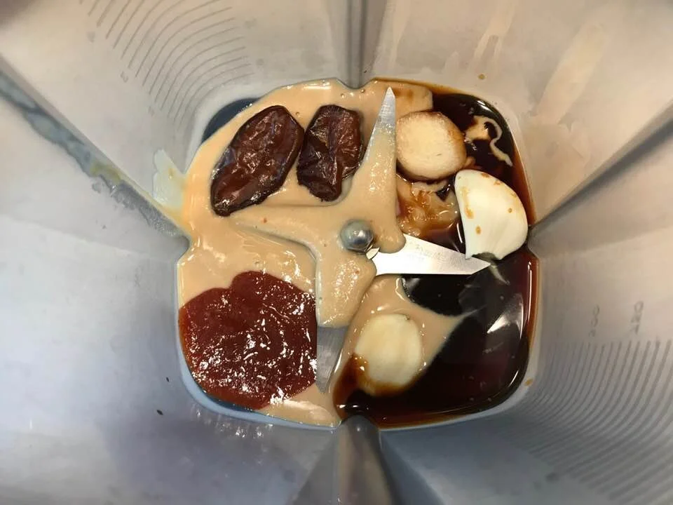While the soy curls are simmering, prepare the satay sauce by mincing the garlic and ginger and add these, ¼ cup tahini, 1 Tbsp. ketjap mannis, 1-2 tsp. sriracha and 3 Tbsp. water in a small bowl. Whisk to combine. (Since I used dates instead of liquid sweetener, I mixed all of the ingredients using the Dry Container of my Vitamix high speed blender. I made a double batch.)