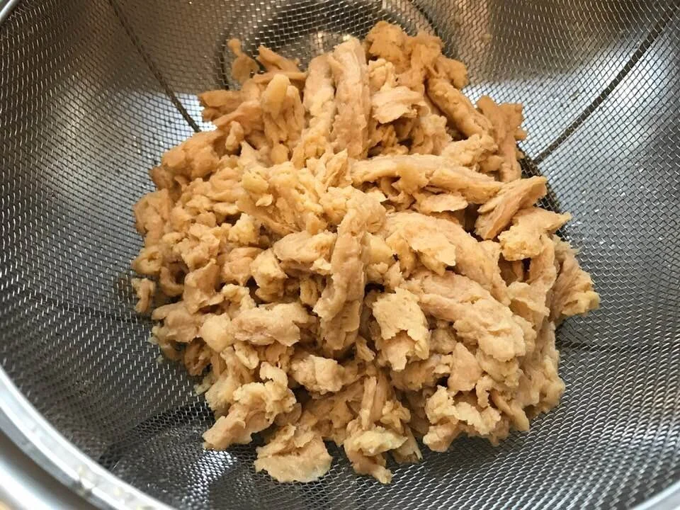 Once the soy strips are rehydrated, drain them. Press them against the side of the colander to get some more of the moisture out.